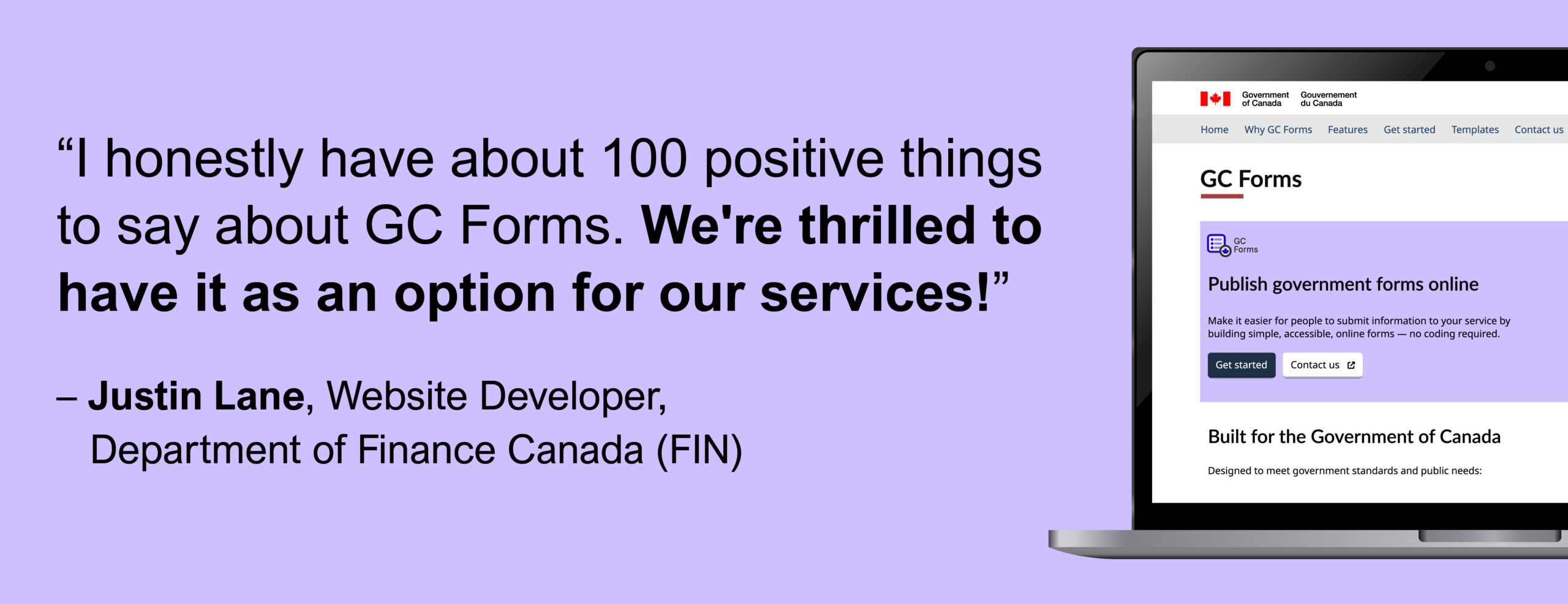 New People Behind The Service product testimonial for GC Forms from Justin Lane (Website Developer), Department of Finance Canada (FIN)!